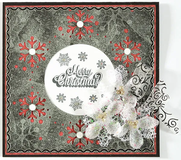 Die Cutting: Follow your die cutting machine’s manufacturer instructions for die cutting Softly Falling Snow from a 5 3/4” square of black cardstock. Embossing: Use stencil tape to secure the cardstock to the stencil. Run through your machine again to emboss the die cut square by sandwiching the cardstock between the embossing mat and the Softly Falling Snow cutting die and run through the die cutting machine, shimming as necessary to get detailed embossing.