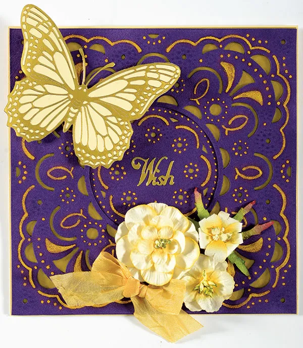 Card front: Cut a 6”x12” ivory cardstock. Score in half and fold on the scored line for a 6” square card. Place with the fold at the top. Cover the card with hammered gold paper. Foam tape the violet suede die-cut/embossed square centered on the card, and glue the circle on the center. Paint the Gold Smooch® ink onto some of the embossed areas of the design of the violet suede square and inner circle. Let dry thoroughly.
