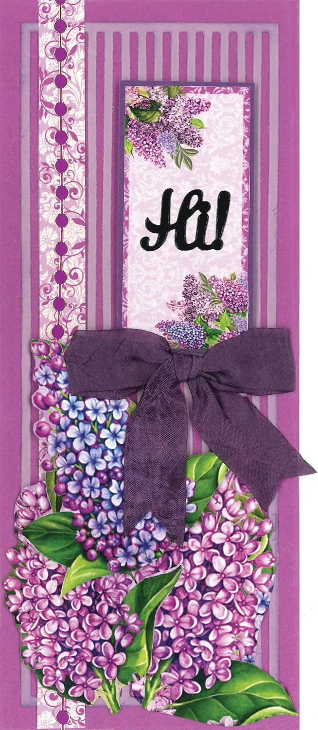 Debbie covered her Slim Line Card with purple Lilacs in Bloom Cardstock. She used the cutting die on light purple Cardstock and inked the edges using a blender brush with Damson Wine Harmony ink pad. She glued it to the card. Debbie cut ½” wide strip of Lilac in Bloom Papers and glued it ½” from the fold. Purple Border Dazzles™ stickers were placed in the center. She cut out lilacs from the Papers then glued and foam taped them at the bottom. She foam taped the Lilacs in Bloom cut out and added Everyday Greetings Dazzles™ on top. A bow from Purple Ribbons Set was Zotted™ as shown. All products available from PaperWishes.com.