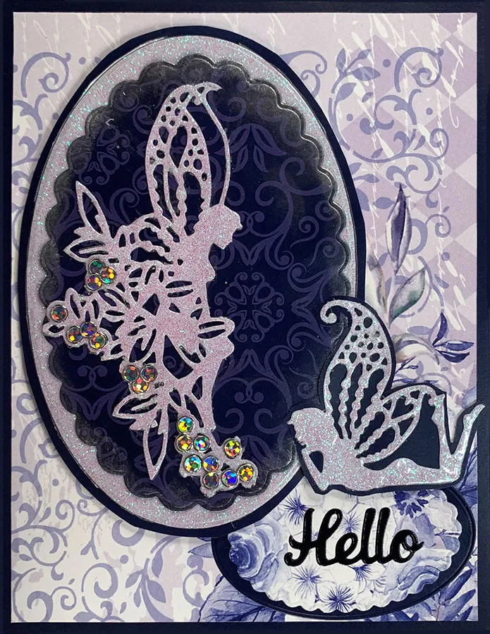 Debbie covered her 5”x6.5” card with Blue Persuasion Cardstock. She glued 4.75”x6.25” Blue Persuasion Paper on top. She used 12 Oval & Scalloped cutting dies on the Blue Persuasion items as shown. With a Blender Brush she added Midas Silver Ink Pad to the scalloped oval. She put Clear Glitter Sheets on white Persuasion Cardstock and die cut both fairies and one oval. She glued the larger fairy on the oval and backed the smaller one on blue Persuasion Cardstock then cut out. Everyday Greetings Dazzles™ and Silver Jewel Dazzles™ stickers complete the card.