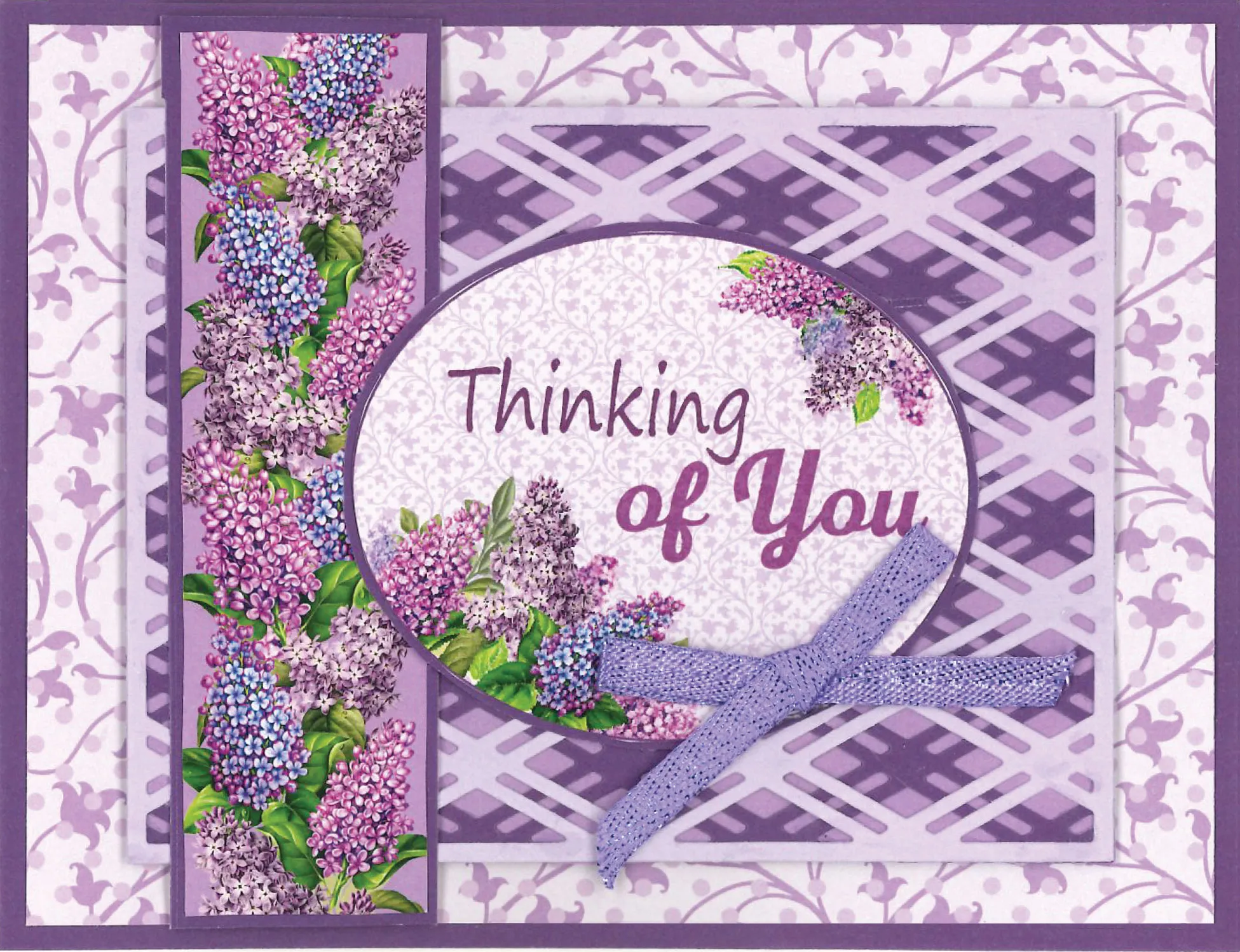 Debbie covered her 6.5”x5” card with Lilacs in Bloom Cardstock then glued 6.25”x4.75” Lilacs in Bloom Paper to the front. She die cut the Background from two Lilacs Cardstock, overlapped them onto another Lilacs Cardstock and foam tapped them to the card. She matted two Lilacs cut-outs onto Lilacs Cardstock with 1/16” borders and glued them as shown. A Purple Ribbon Set bow was Zotted™ in place.
