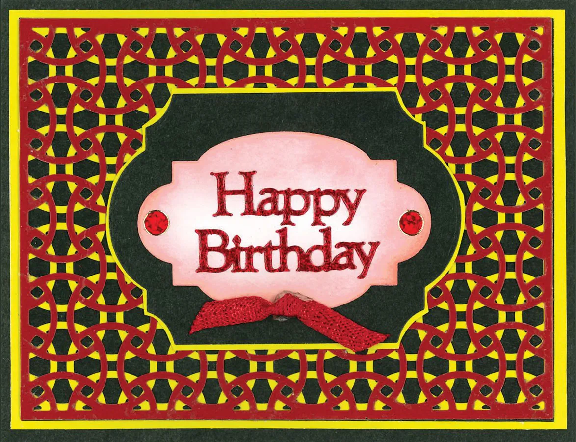 Debbie covered her 6.5”x5” card with Gingham #1 Cardstock. She used the cutting die on yellow and red Gingham #1 Cardstock then overlapped the layers to form circles (clever!). She used 8 Labels for Your Greetings cutting dies with the same Cardstocks. She used Blender Brushes with Chinese Red Harmony Ink Pad and glued the layers together. Happy Birthday Dazzles&trade,; Red Jewel Dazzles™ stickers and Glimmer Ribbon bow were the finishing touches.