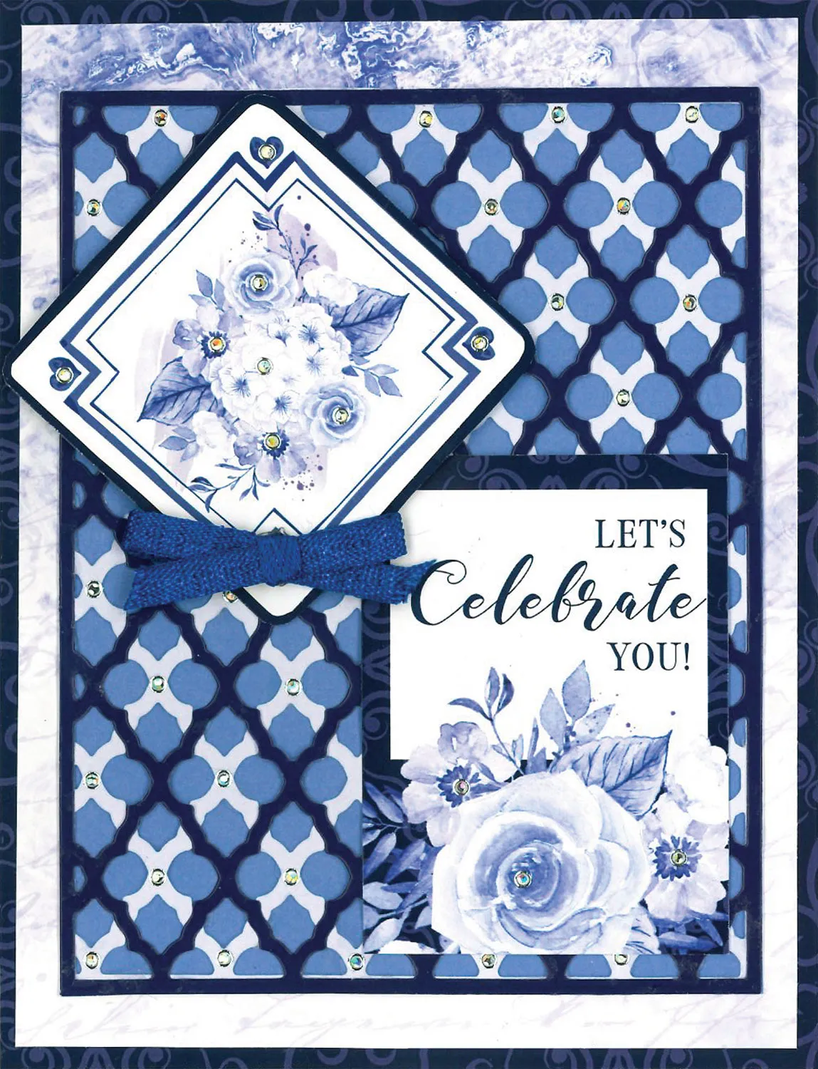 Debbie covered her 5”x6.5” card with Blue Persuasion Cardstock. She glued 4.75”x6.25” Blue Persuasion Paper in the center. She die cut the Background from two Persuasion Cardstocks, overlapped them, glued them to a third Persuasion Cardstock and onto the card. She matted two Persuasion cut-outs on Cardstock then glued and foam taped them in place. Silver Jewel Dazzles™ stickers and a Glimmer Ribbon Set bow finished the card.