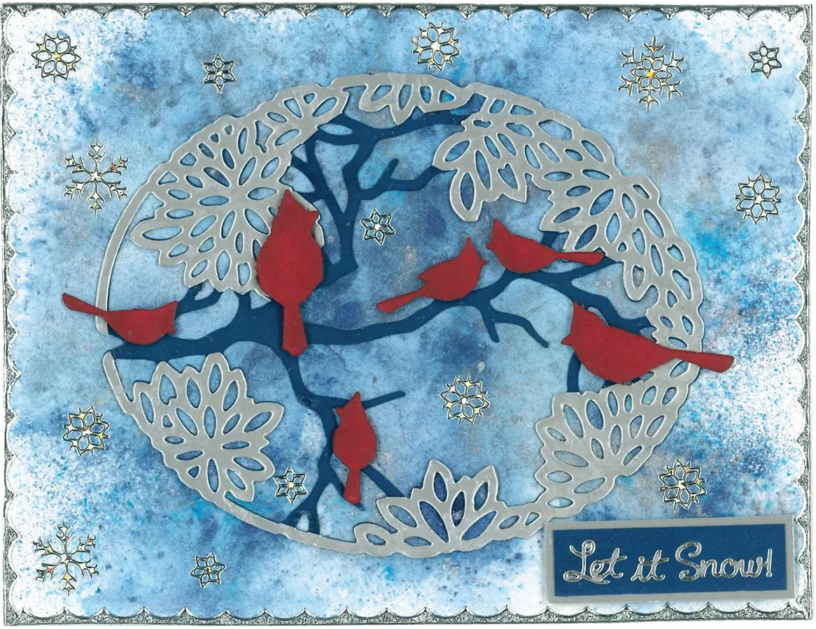 Debbie used Ocean Blue Suede and Silver Metallic papers with this cutting die. To make the background she tapped Denim Dash, Electric Blue and Gunmetal Shimmer Shakers onto the 6½”x5” card then Spritzed water to blend the colors. She glued the die cuts in place and added Snowflake Dazzles™ stickers on the background and Silver Border Dazzles™ around the card edges. She used Cardinal Cutting Dies from red cardstock and glued them among the branches. Christmas Greetings Dazzles™ were placed on Suede and matted on Silver then foam taped to the card.
