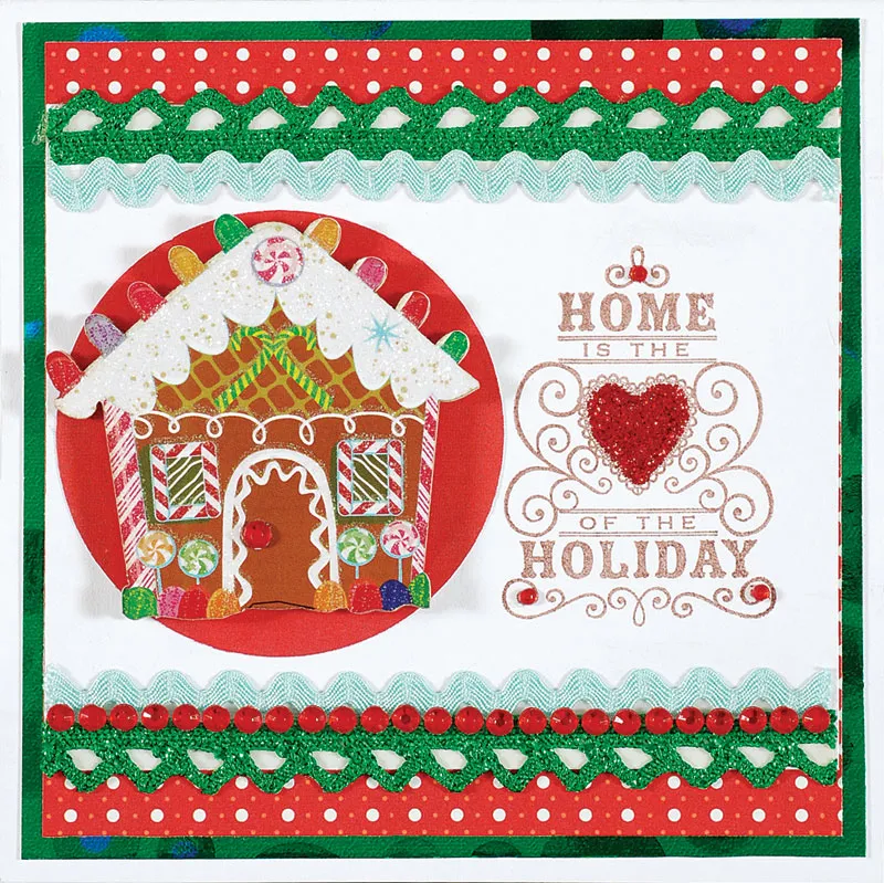 Place Ultra Tape horizontally on both the top and bottom of the white cardstock. Place Green Fancy Trims crochet and Teal Fancy Trims rick rack over tape as shown. Place a strip of red rhinestones over the green trim on the bottom of the card. Add single rhinestones to the sentiment and Layered Gingerbread House as shown. Fill in the stamped heart with Red Glitter Stickles and let dry.