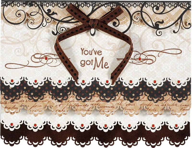 Stamp “You’ve got Me” centered under the top border artwork. Stamp a flourish to the right and left of your text. Cut a 6 1/2”x1 1/2” border artwork paper to match the artwork at the top of your card. Use X-acto® knife to cut around lower edge of black scrollwork. Foam tape to top edge of card, matching artwork. Tie a bow with 12” length of ribbon. Zot™ onto border artwork, above text stamp. Place small Jewel Dazzles™ on each flourish, and on each scallop of ivory paper border.