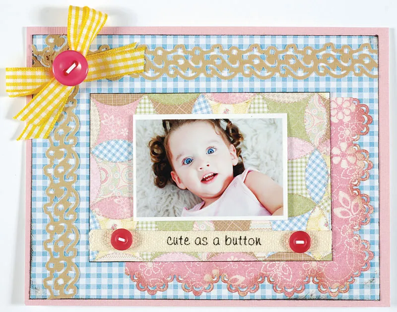 Glue a length of twill ribbon across the bottom. Thread bright pink buttons with white paper strips and glue to each side of the twill. Mat a 2 5/8”x 1 3/4” photo with white cardstock, leaving a 1/16” border. Foam tape to the card, above the twill. Tie 2 lengths of yellow gingham ribbon into a bow and glue to the top left card corner where the borders cross. Glue a medium pink button to the center.