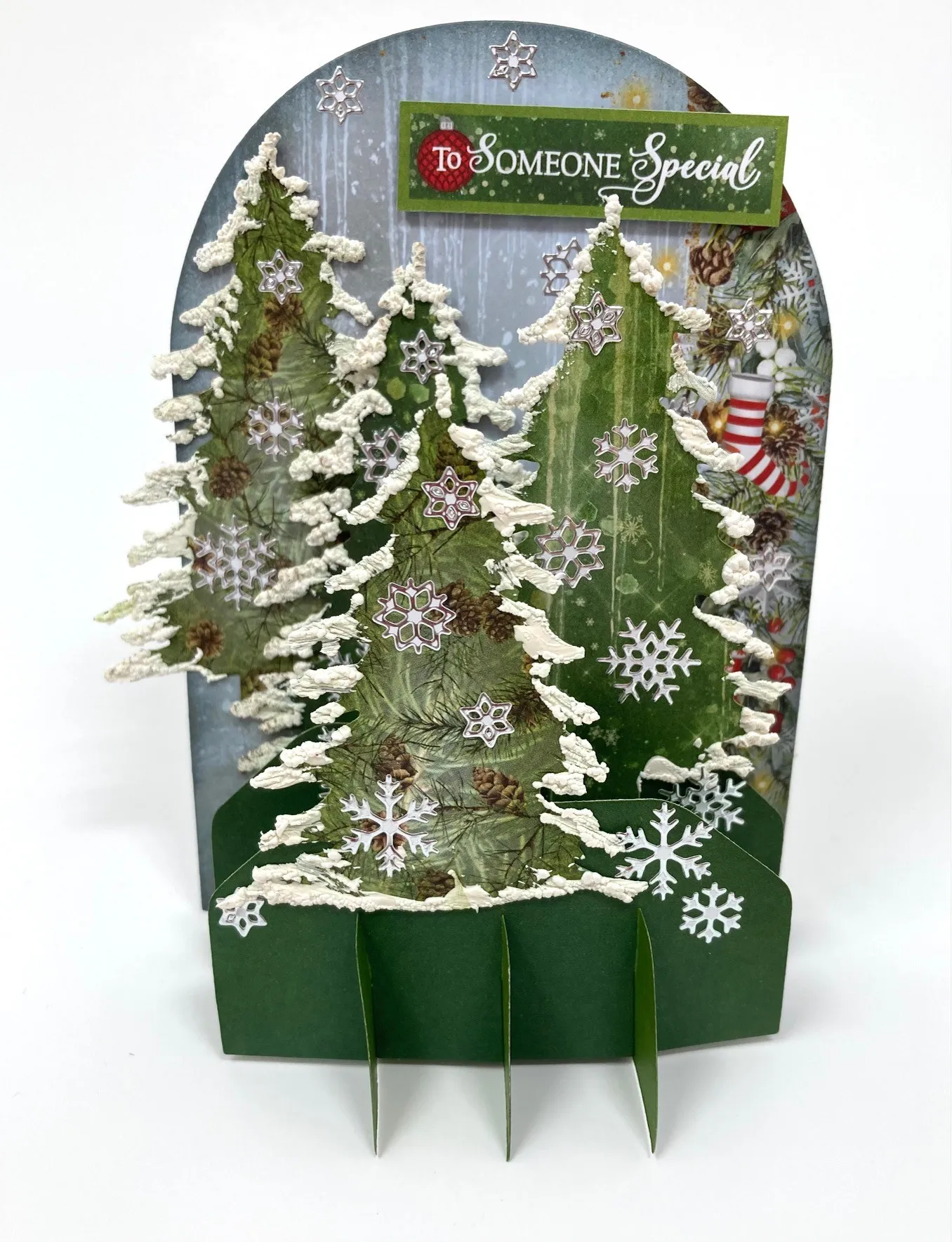 4. Foam tape the “to someone special” cutout to the backdrop at the upper right. Place white snowflake Dazzles™ on the trees, crossbars, and backdrop as shown.