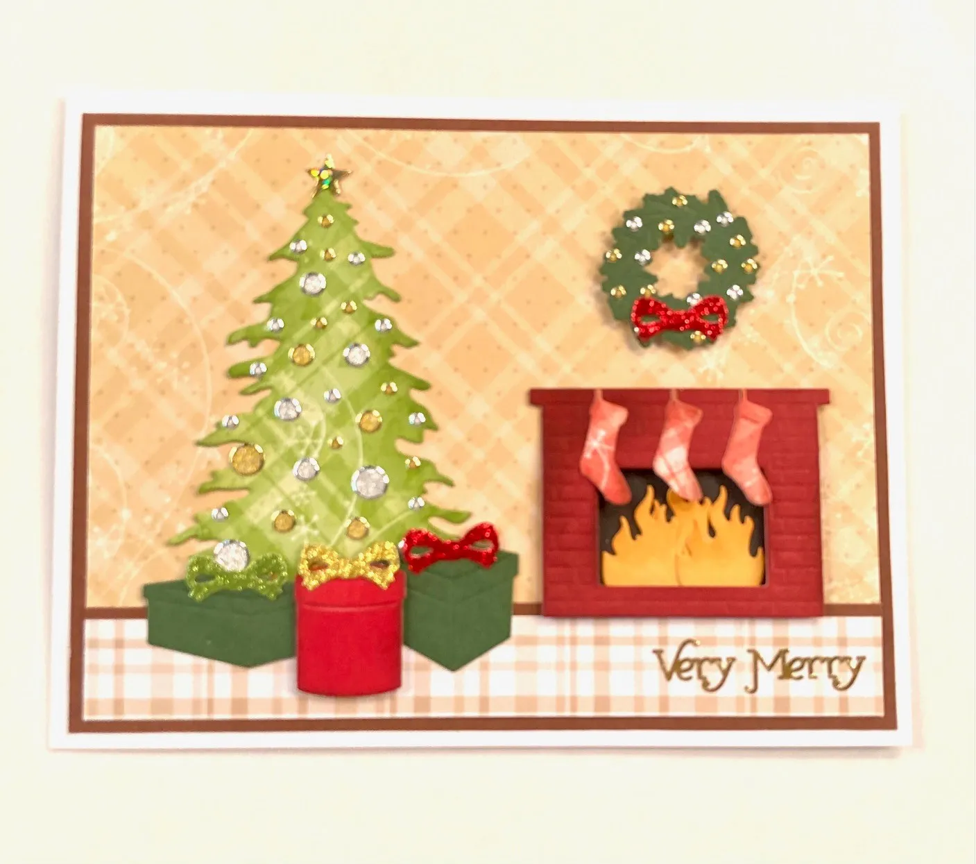 2. Die cut a tree from Joyful Christmas green plaid cardstock and ink the edges with Khaki. Glue it to the front at the left. Die cut the fireplace from dark red cardstock and ink the edges with Cocoa Bean. Cut 1¾"x1½" black cardstock and foam tape it behind the fireplace opening. Die cut three yellow cardstock flames, ink the edges with Roasted Pumpkin, then glue them inside the fireplace opening. Glue the fireplace to the front as shown.