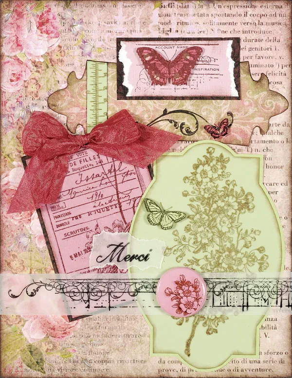 Technique: (Stamping on vellum) Stamp the large floral botanical image on vellum and let dry. Use the template to trace a squared oval label A shape around it so the stamped image is centered on the shape. Stamp a small butterfly near the flowers with brown ink. Ink the edges of the vellum shape brown and mat on light green cardstock. Stamp “Merci” on white vellum with black ink and tear around the word. Stamp The swirls and lines border on vellum with black ink. Let dry, then trim to a rectangle.