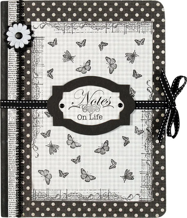 Glue the center portion of a 1 yard length of black stitched ribbon across the middle of the book. Tie the ends in a bow to secure the book. Trace the Square Oval Label A onto black cardstock. Print a title on the plaid paper, leaving space between the first and second line of text for a stamped image. Trace with Square Oval Label B, ink the edges black and glue to the center of the larger label. Secure a black mini brad on each side. Foam tape over the ribbon. Layer flowers and secure with a black brad. Glue near the top of the loopy ribbon border.
