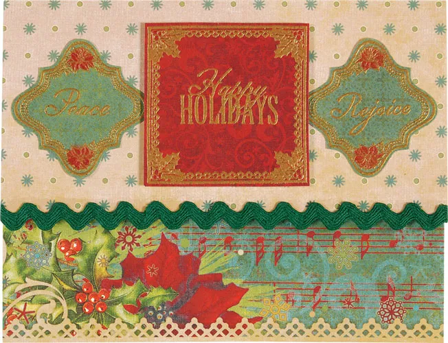 Card Front: Place the card with the fold on the top. Cut front flap to 6 ½” x 3 ¼”. Cut tan paper to 6 ½” x 3 ¼” and glue to the front of the card. Emboss square frame with greeting onto red swirled paper and cut around the edge. Emboss two scalloped squares onto green paper and cut around the edge. Position pieces and glue scalloped squares to the card. Foam tape red square to the card. Glue green ric-rac ribbon along the bottom edge of the front flap on the card.