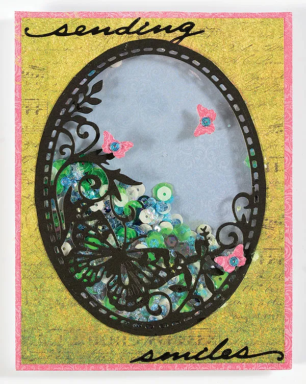 Use the die cutting machine and large oval die to cut a black cardstock die-cut. Cut around the edge, leaving a 1/8” border. Use the craft glue to glue on the card front, and the inside shapes to the acetate.