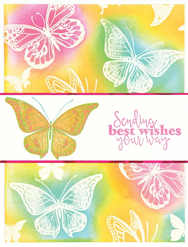 Cut a 4 7/8”x6 3/8” white cardstock. Stamp the yellow circle butterfly stamp in VersaMark™ ink 2-3 times on the cardstock. Stamp off the edges of the cardstock. Ink the pink circle #3 butterfly with VersaMark™ ink. Stamp 2-3 times over the same cardstock. Ink and stamp the #3 butterfly stamp, and stamp over the cardstock. Dust with white embossing powder. Tap off the excess. Heat with a heat tool. Fill in the holes on the cardstock with small butterflies stamps, inked, and heat embossed with white embossing powder.