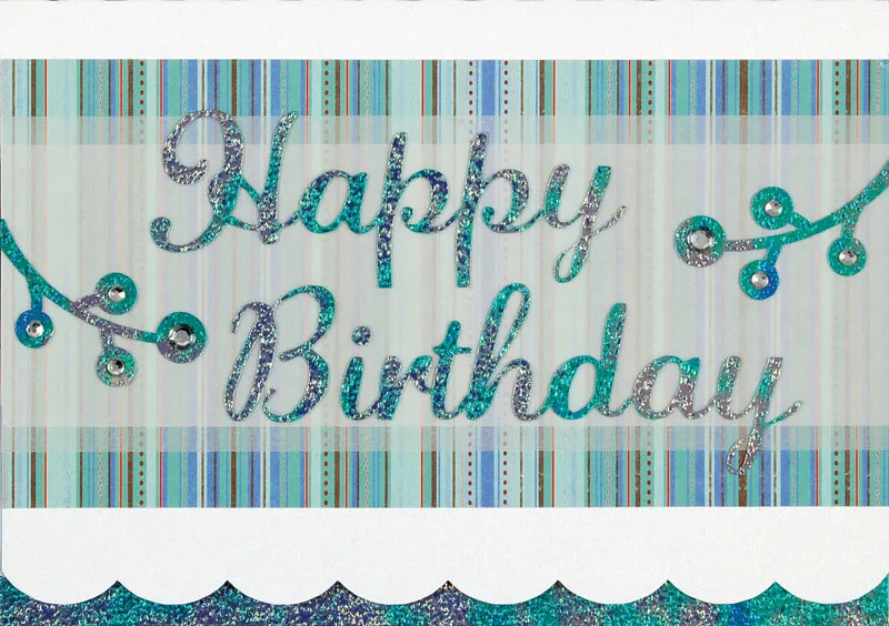 Use the Silhouette to cut “Happy Birthday” from blue iridescent paper and glue centered to card. Cut two small branches (Branch 1009) out of the same paper and glue to either side of the greeting. Place 5mm and 3mm clear crystals on the ends of the branches.