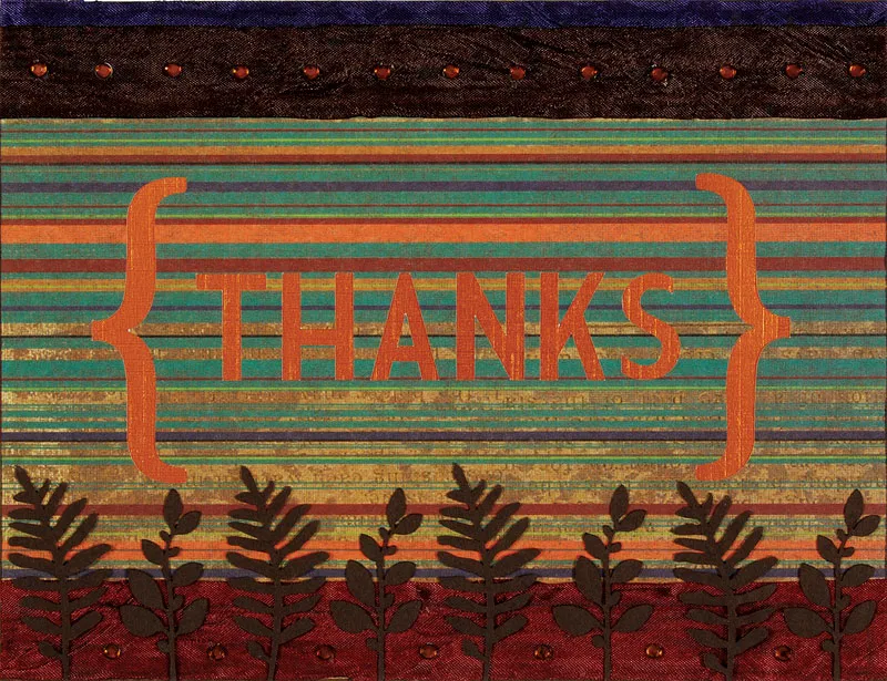 Use the Silhouette to cut “{thanks}” into a 6 ½”x5” piece of striped paper from the Rich and Spicy papers. Remove the letters and glue the background to the card so that the orange foil shows through the letter holes. Glue the loose pieces of the letters down (the middle of the A). Save the two curly brackets.