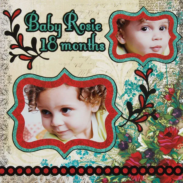 Start with a roses corner paper with the embellished corner at the bottom right. Using the Silhouette, cut out a 4 ½” wide frame and a 7” wide frame (Frame 1025) from red patterned paper. Cut photos to fit behind the frames. Cut a 5” wide frame shape and a 7 ½” wide frame shape out of teal patterned paper. Glue the photos and red frames to the teal frame shapes. Mat both pieces on black cardstock, leaving a 1/16” border. Glue the smaller photo at the top right, 1/8” from the right and ½” from the top. Glue the large photo ½” from the left and 1 ½” from the bottom.