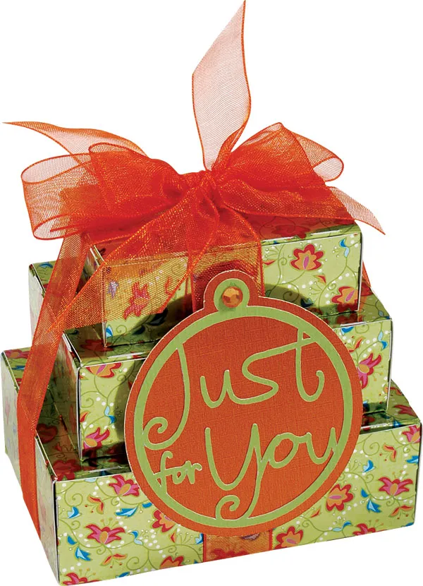Cut out the “Just for You” shape (Tag 1046) about 2” wide from light green paper. Use the Offset feature on the software to cut out a mat for the tag from orange foil specialty paper. Glue the tag onto the mat and add a 5mm orange crystal at the top. Use Zots™ to adhere the tag to the front of the stacked boxes.