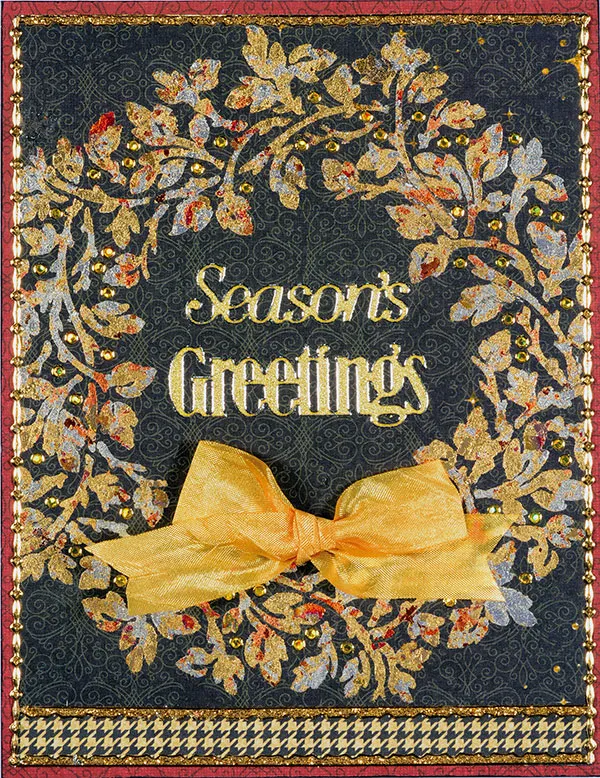 Glue a 1/2" wide strip of Christmas Wonder black/ivory hounds tooth paper even with the bottom of the black paper, trimming sides evenly. Place Gold Jewel Border Dazzles™ at the edges of the papers. Glue centered on the card. Place Dazzles™ gold “Season’s Greetings” centered inside the wreath. Place Gold Jewel Dazzles™ among the vines in the wreath. Use 3/4" wide yellow crepe ribbon to tie a bow and Zot™ in place.