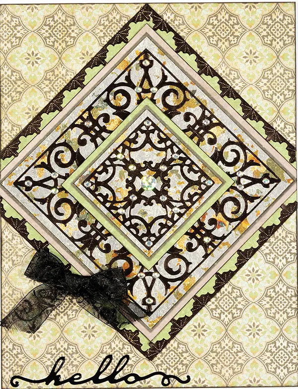 Ink the Quilt Blocks Dazzles™ that you will be using with Black SurfaceZ ink and let dry. Cut one 3 1/2" square and two 1 3/4" squares from white cardstock. Cover each with Double Sided Adhesive, then cover with Silver Dream Gilding Flakes. Use the Scoochy Foam to remove the excess flakes. Add inked Quilt Blocks Dazzles™ centered on each square. Mat the large block on patterned paper and turn on point. Glue it centered on the paper-covered card front. Foam tape a smaller quilt block centered on the large one as shown. Add inked Dazzles™ borders as shown. Place Dazzles™ as shown. Zot™ bow in place.