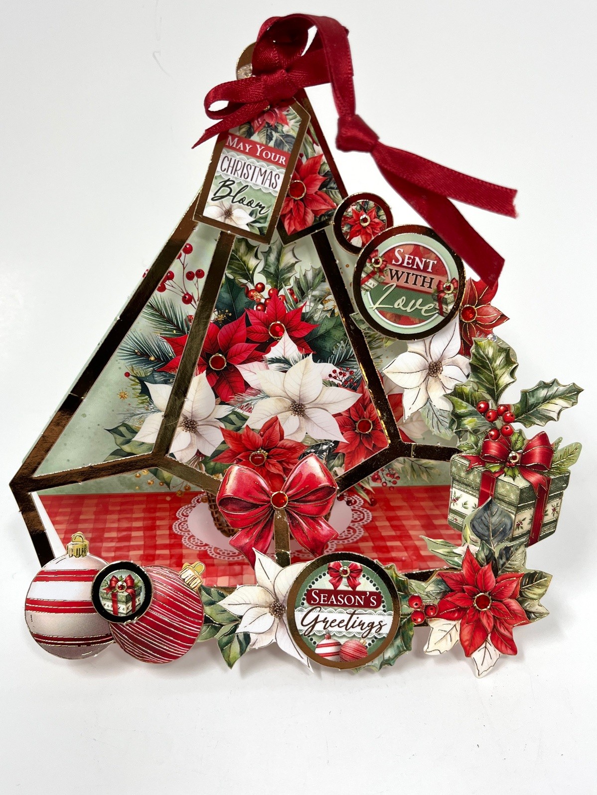 Assemble card as instructed in the package. Fold the red ribbon in half. Push the loop through the hole in the top of the terrarium then insert the ribbon ends into the look and pull tightly. Tie a knot in the loose ends to hang. Foam tape the matching art as shown. Place Red Jewel Dazzles™️ in the flower centers and as shown.