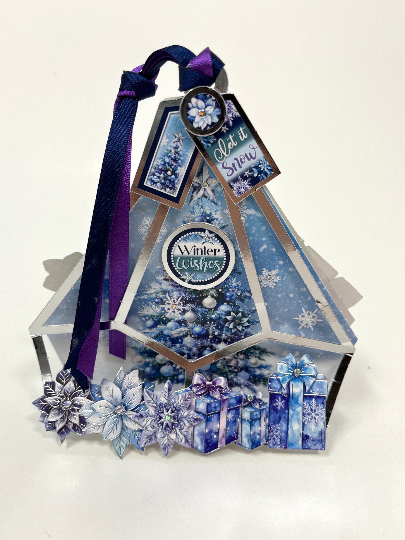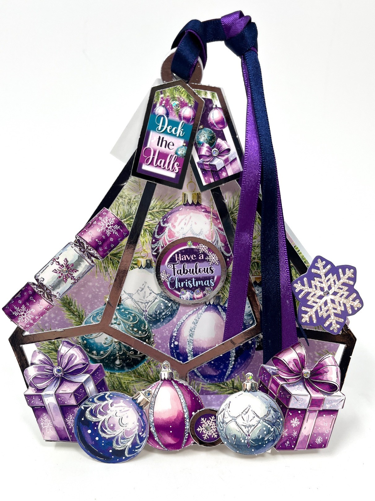 Tape together “Deck the Halls” and “Winter Wonderland” patterned terrariums back to back. Construct normally as per instructions using extra sticky tape. Foam tape the foiled die-cuts as shown. Place Silver Jewel Dazzles™️ on both sides in the snowflake and flower centers and on the ornaments as shown. Use the blue and purple ribbons together and fold in half making a loop. Push the loop through the hole in the top of the terrarium then insert the ribbon ends into the look and pull tightly. Tie a knot in the loose ends to hang.