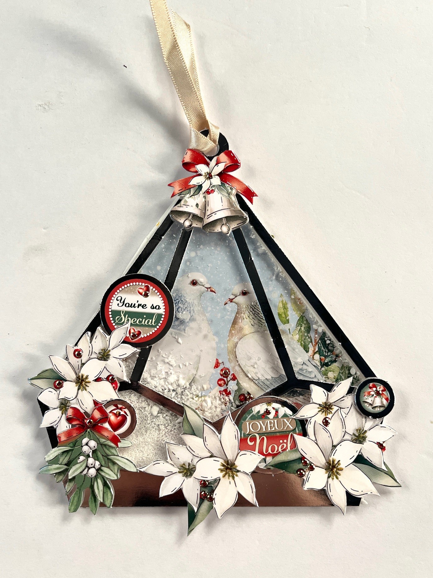 Lay the “Delightful Doves” printed base down and place two layers of foam tape along the edges. Place two teaspoons of Soft Snowfall in the center. Remove frame and place over the foam tape. Tape and foam tape the foiled accents as shown. Place red Jewel Dazzles™️ as shown. Fold the white ribbon in half. Push the loop through the hole in the top of the terrarium then insert the ribbon ends into the look and pull tightly.