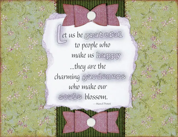 Tear out around the card quote and chalk. Glue overlapping the floral strip. Glue dot the last bow to the bottom of the quote.