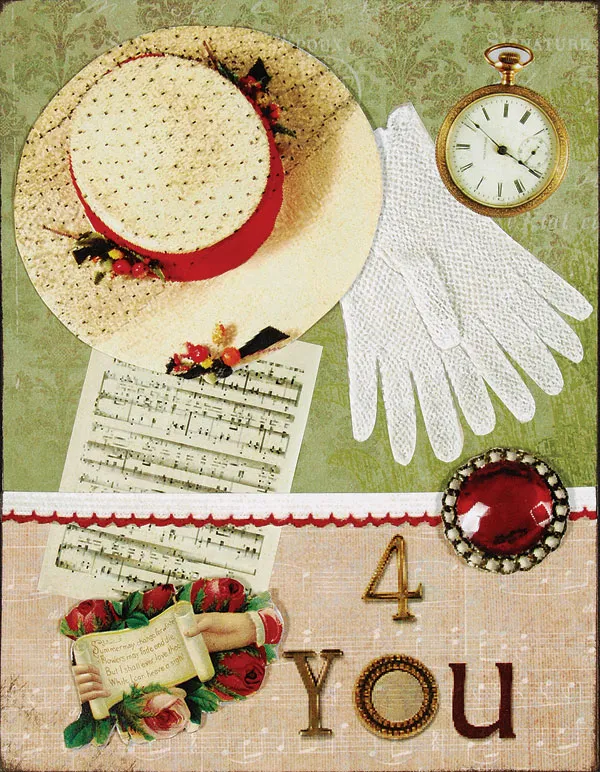 Glue the music sheet below the hat, extending into the brown music paper. Cut the red/white border and glue across the seam of the 2 papers. Glue the red broach cut-out to the right side of the border. Foam tape the Victorian Valentine to the left.