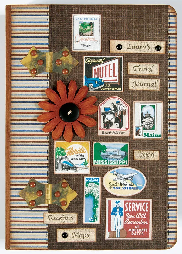 Print hinges and cut out. Ink the edges and add mini brads to the hinges. Glue to the front of the binder and trim the edges flush. Ink the edges.