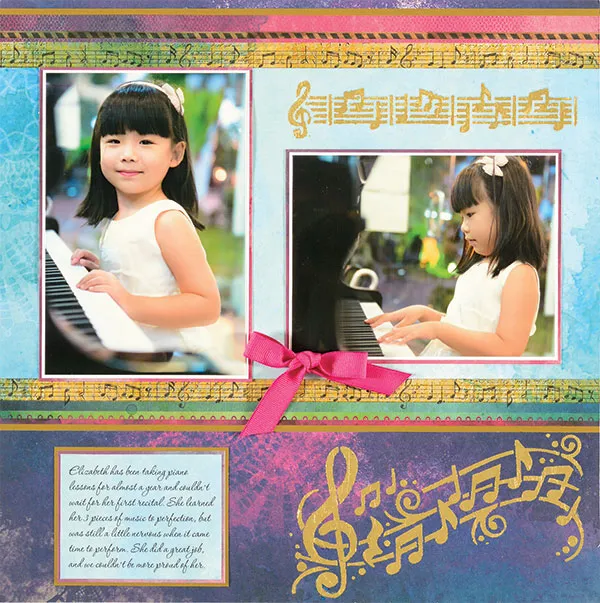 You will use the purple/pink-textured paper for your background. Cut a 12”x6 1/4" light blue watercolor paper and glue it across a sheet of striped paper with music notes above and below the light blue paper. Trim top and bottom as shown and mat on gold paper. Glue across the background paper, 1/8” from the top. Mat the photos on white cardstock, then pink/blue textured paper and glue on the light blue paper as shown.