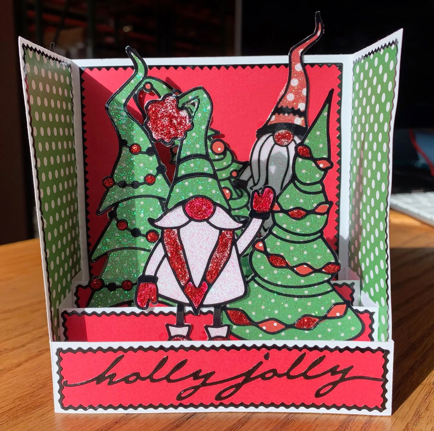 Cut and glue printed paper and cardstock panels on both sides of each section of the box leaving a 1/6” white card edge. Outline each panel with black Thin Line Dazzles™. Glue the 8 1/2” strip to the outside sides of the card keeping it even with the bottom edge of the card.