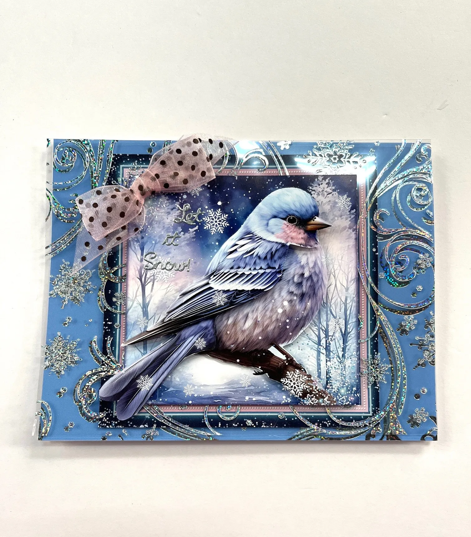 6 1/2"x5" foiled acetate and secure to front placing extra sticky tape only in the center. Trim off the frame, 1/4", of a duplicate Little Book page and foam tape to match the frame below. With remaining pages trim out and layer the bird onto the page. Make and Zot™️ a 2" wide dotted pink bow in the top left corner of the frames. Place "Let it Snow" Dazzles™️ as shown.