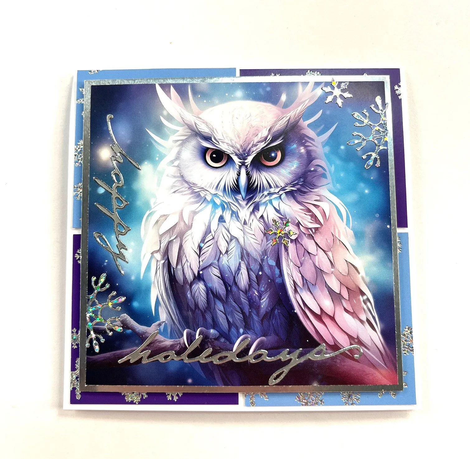 Inside: Cut a 4 5/8" square out of the blue and purple cardstocks then cut them in half diagonally. Glue leaving 1/8" white borders. Cut a 4" silver cardstock square and foam tape at an angle in the center. Trim 3 3/4" square of the pink owl Little Book page and secure to the silver cardstock squarely in the middle. Trim out three more layers from the little book pages and foam tape on top of each other matching the art. Add “merry Christmas” and snowflake Dazzles™️ as shown.