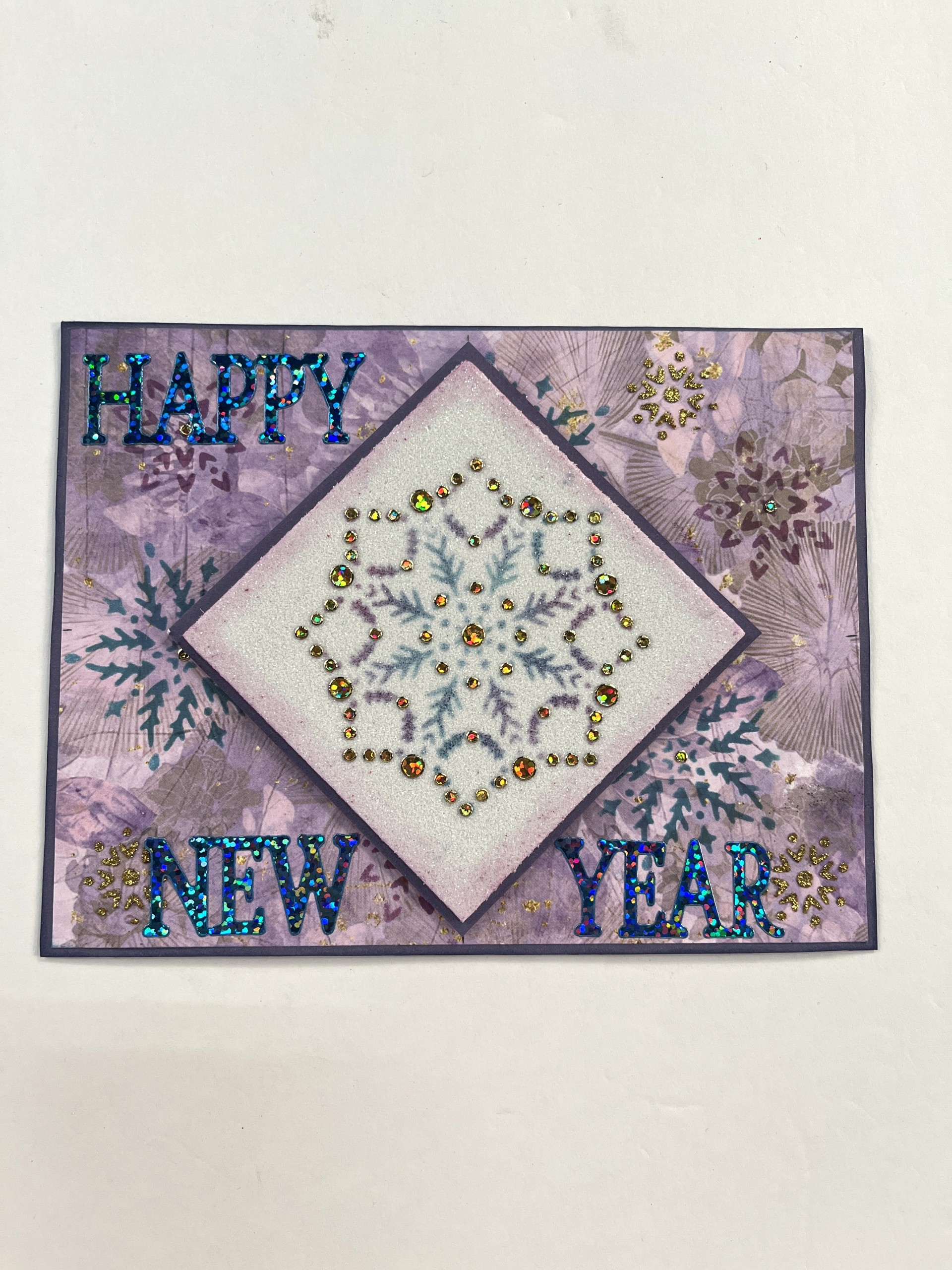Cut a 3 ¼”x3 ¼” white glitter foam. Place the largest snowflake shown centered on the foam. Using Teal and Orchid inks, cover the snowflake. Blend the colors in some areas. When dry, place the gold jewel Dazzles as shown. Mat on solid cardstock, and foam tape on point to the center of the card.