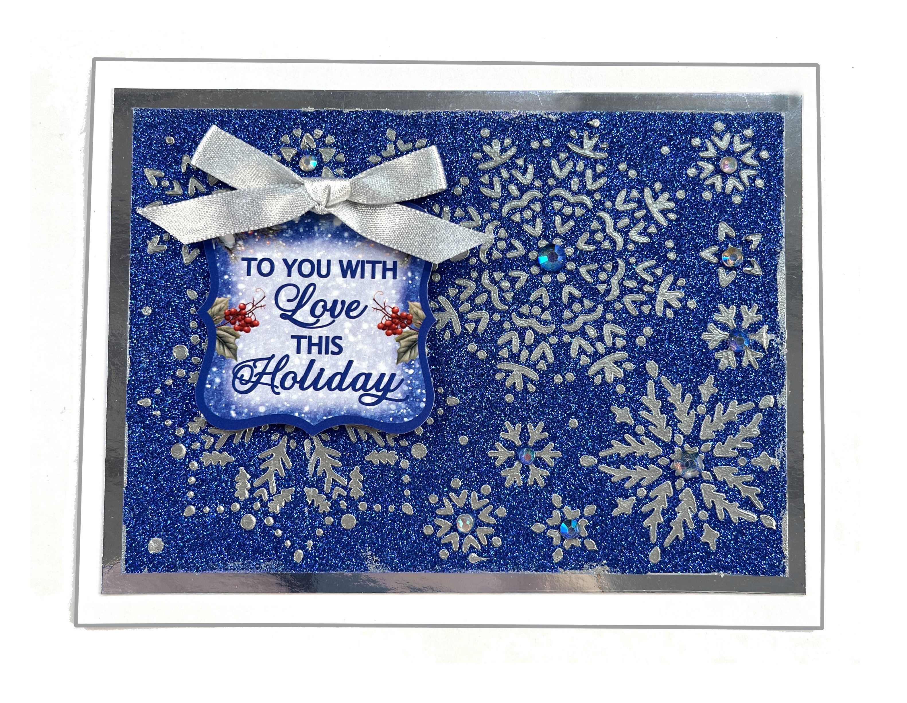 Mat the blue glitter cardstock with Silver Mirri Cardstock, leaving a 1/8” border and glue to the card center. Foam tape the Christmas Cardinals Die-Cut greeting to the card and add a silver bow using a Memory Zot.