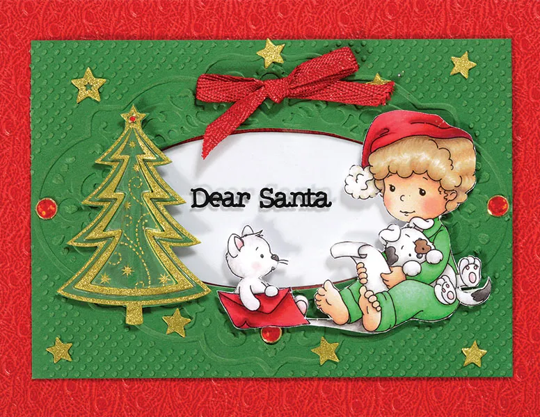 Cut out the child and animal shapes from the card topper, and foam tape to the right side of the oval window. Back a tree Dazzles™ with green cardstock, and cut close to the Dazzles™ edge. Foam tape to the left side of the oval. Zot™ a red metallic bow to the top of the oval. Place the red jewel and star Dazzles™ as shown. Place the “Dear Santa” Dazzles™ on the acetate.