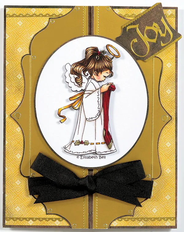 Foam tape the angel/stocking focal onto the left panel only, 1” from the top, centered over the opening. Trace and cut out an elegant label from Darkroom brown scuff paper and place “Joy” and Thin Lines Dazzles™ as shown. Foam tape onto the right panel, just under the angel focal edge. Place Brass Jewel Dazzles™ onto the label as shown.