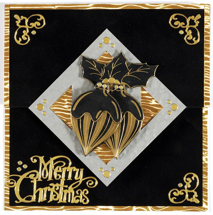 Place a full stacking set of the clear foiled ornament stickers from the 3-D Christmas Book on suede. Cut out each piece around the sticker edges (trim the fir needles away from the holly on the large sticker) and foam tape each piece of top of the other in order. Foam tape over the center of the card diamond shape. Place the Corner Dazzles™ on the upper corners and the Brass Jewel Dazzles™ on the diamond, corners and ornaments.