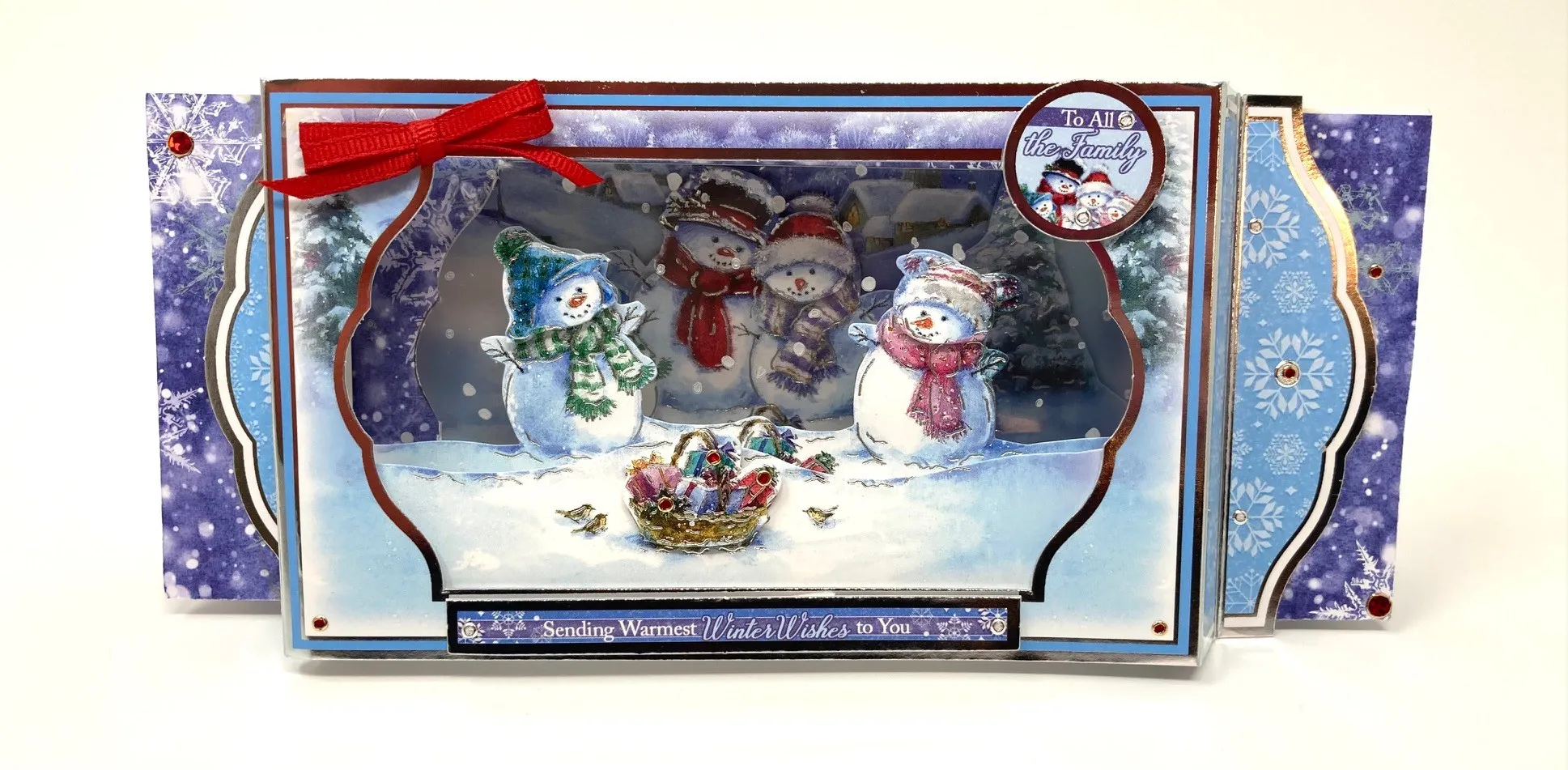 Use extra sticky tape to secure the snow fall acetate from the kit over the evacuated area. Foam tape A3 strip to the acetate. Foam tape A4 and A5 on top of the snowpeople. Foam tape A6 to the back of the foiled card front. With extra sticky tape on the ends of the front section place ¼" from the left and right sides of the card. This will let it fold flat for the mail. Make and Zot™️a 1 1/2" red bow to top left corner of diorama piece. Foam tape the circle Topper to top right corner. Foam tape "Sending warmest winter wishes to you" Topper along the bottom. Place silver pearl and red jewel Dazzles™️ as shown. Foam tape A7 over the matching image.