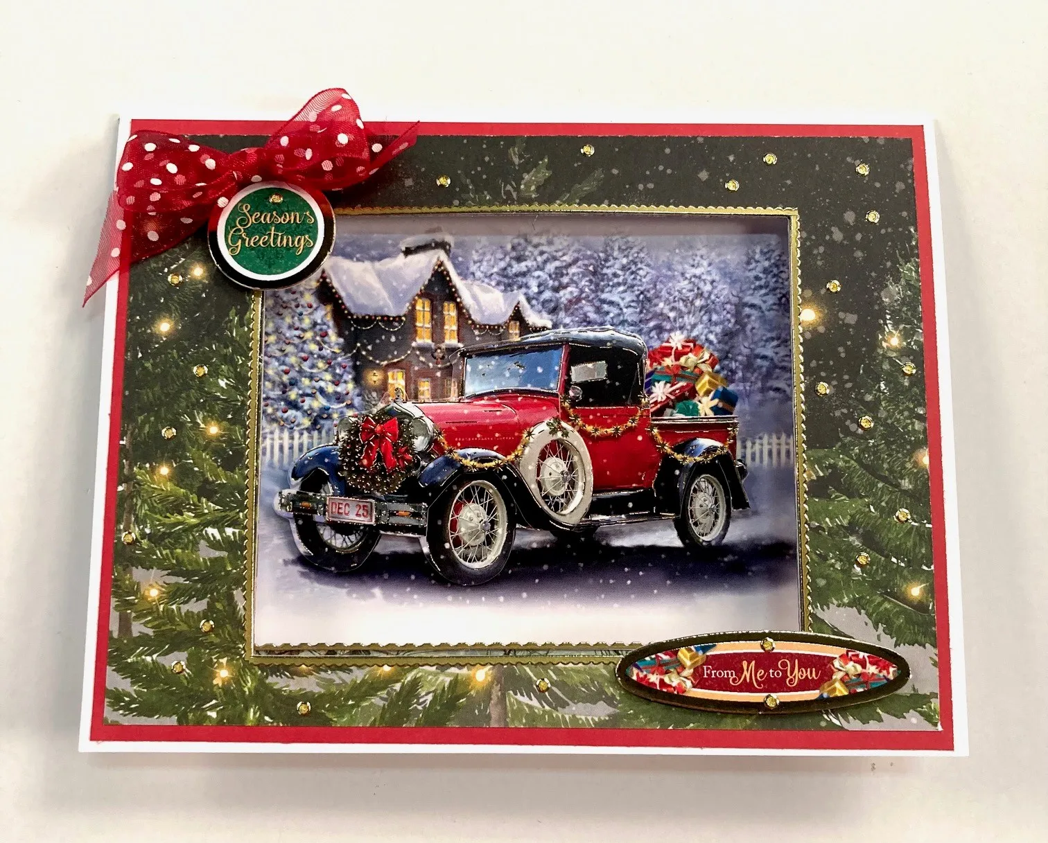 Cut red cardstock to 6 1/4"x4 7/8" and secure to card front with the tape runner leaving a 1/8" white border. Place a 6 1/8"x4 5/8" piece of patterned cardstock on top of this with the tape runner leaving a 1/8" red border. Use low tack tape to secure the third rectangular die to the center of card. Open the card and run through die cutting machine twice to get through the layers. Place thin line Dazzles™️ around evacuated area. Foam tape the round "Season's Greetings" and oval "From Me To You" Toppers from the diorama set as shown. Make and Zot™️ a 2" red bow to top left corner. Place gold pearl Jewel Dazzles™ as shown.