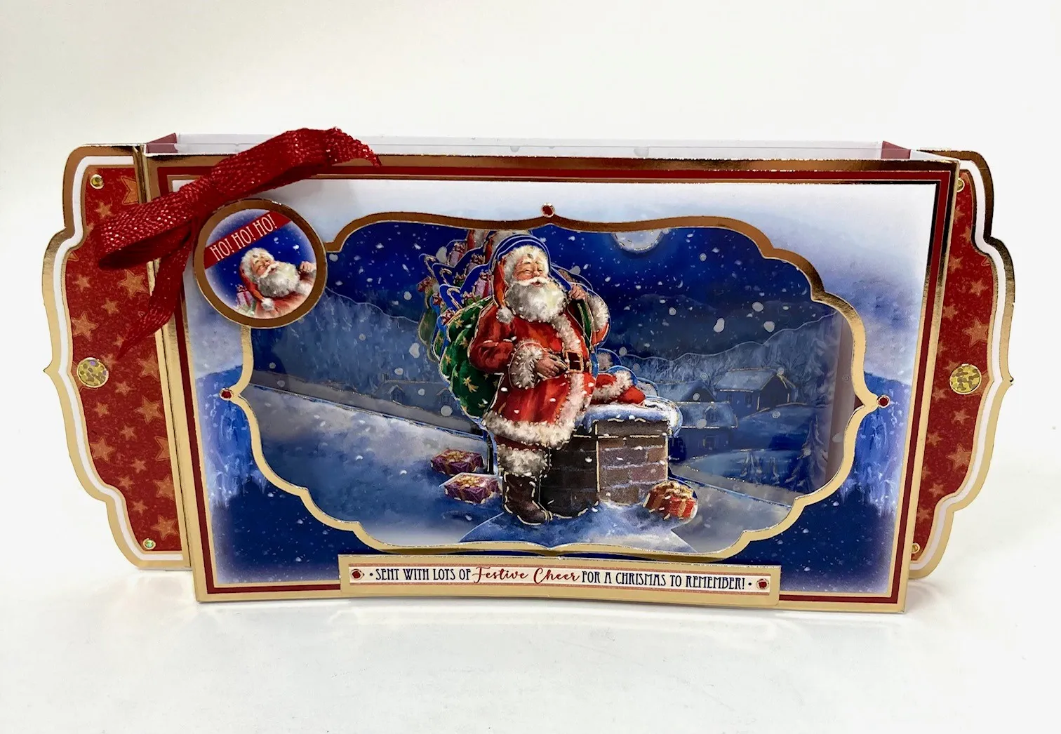 Complete Festive Diorama Concept Card as per instruction for the "Father Christmas is on His Way" selection. When complete add gold Jewel Dazzles™️ to the end panels as shown. Place small red Jewel Dazzles™️ around the scalloped opening as shown. Make and Zot™️ a 2" red bow above the "Ho! Ho! Ho!" sentiment in the top left corner.