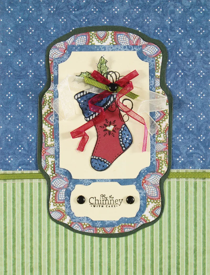Knot the center of green grosgrain ribbon and trim the tails at a length of ½”. Tie a bow at the center of 1/8” red sheer ribbon and trim the tails at a length of 2 ¼”. Cut 4 ¾” of white sheer ribbon. Brad the three ribbons in the following order: green, red, white. Secure the bradded ribbons at the center of the swirls on the cream stocking. Twist the tails of the red and white ribbon and Zot™ them in place as shown. Secure a brad on both sides of “By the Chimney…&rdquo,; ¼” from the edges. Glue the label 1” from the bottom edge of the card.