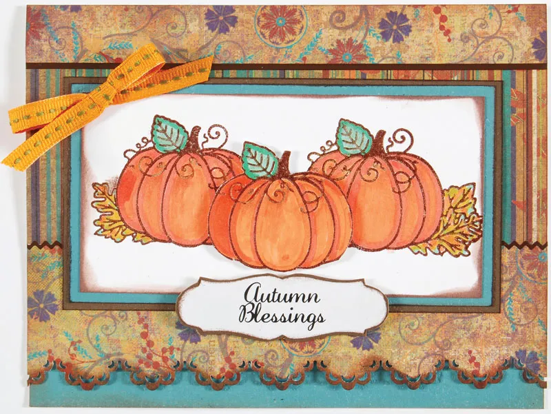 Emboss 2 pumpkins on each side of a 4 7/8”x2 1/2” Ultra Smooth White Cardstock. Stamp and emboss a 3rd pumpkin on separate piece of cardstock. Outline pumpkin leaves with JG2 and color inside with GT2. Outline Pumpkin with OR3 and color in with OR2. Add dots of both GT2 and OR2 on maple leaves and color majority of leaves with GB7. Cut out the single pumpkin and foam tape between the other pumpkins. Ink the white cardstock edges brown and mat with teal and brown cardstocks, leaving 1/8” borders. Glue to the card center.