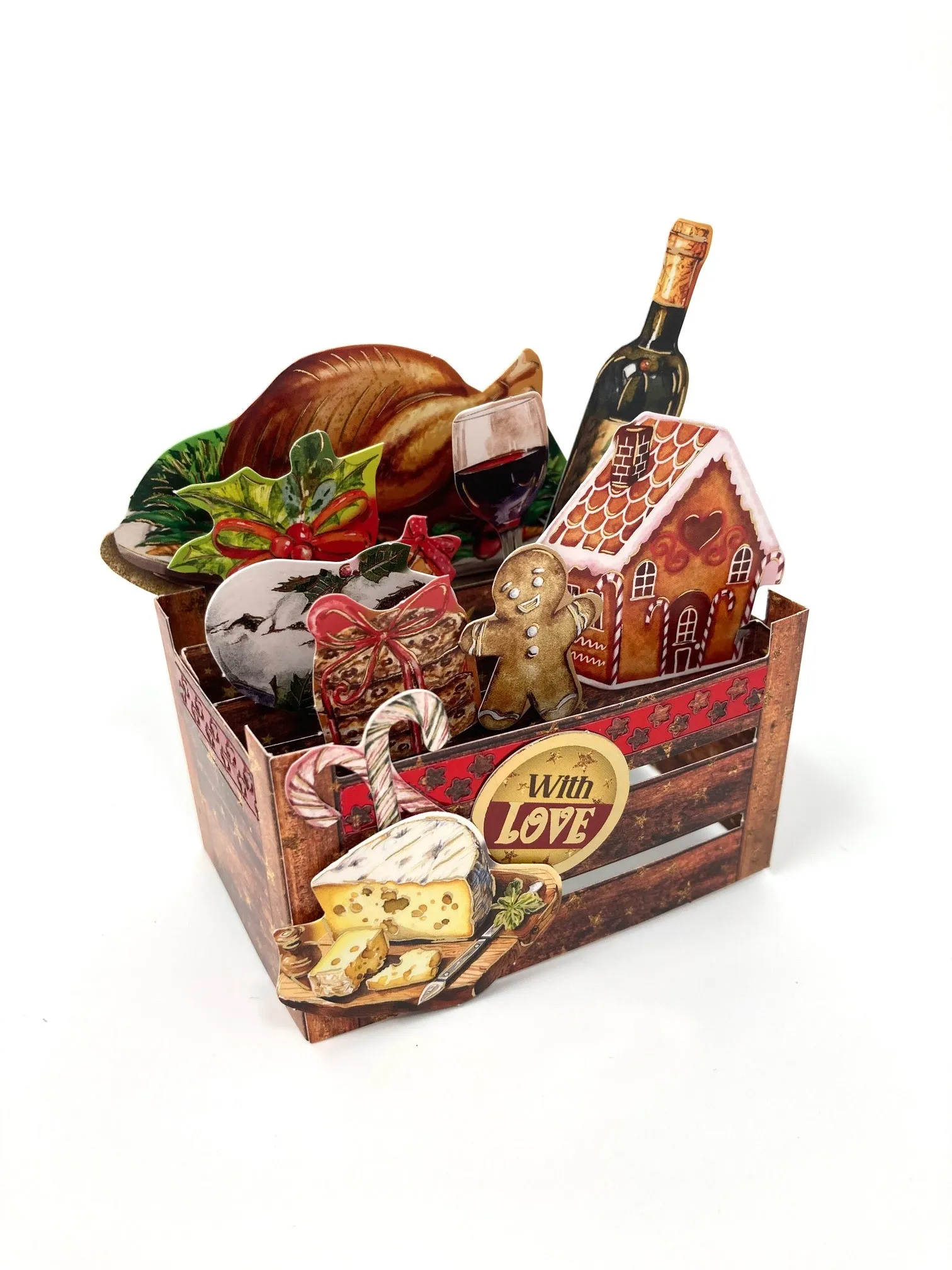 2. Use glue and foam tape to attach all the die-cuts but the cheese, labels, and candy canes to the inside crate back and crossbars. Glue the “with love” and candy cane die-cuts to the crate front at the upper left, then foam tape the cheese board as shown.
