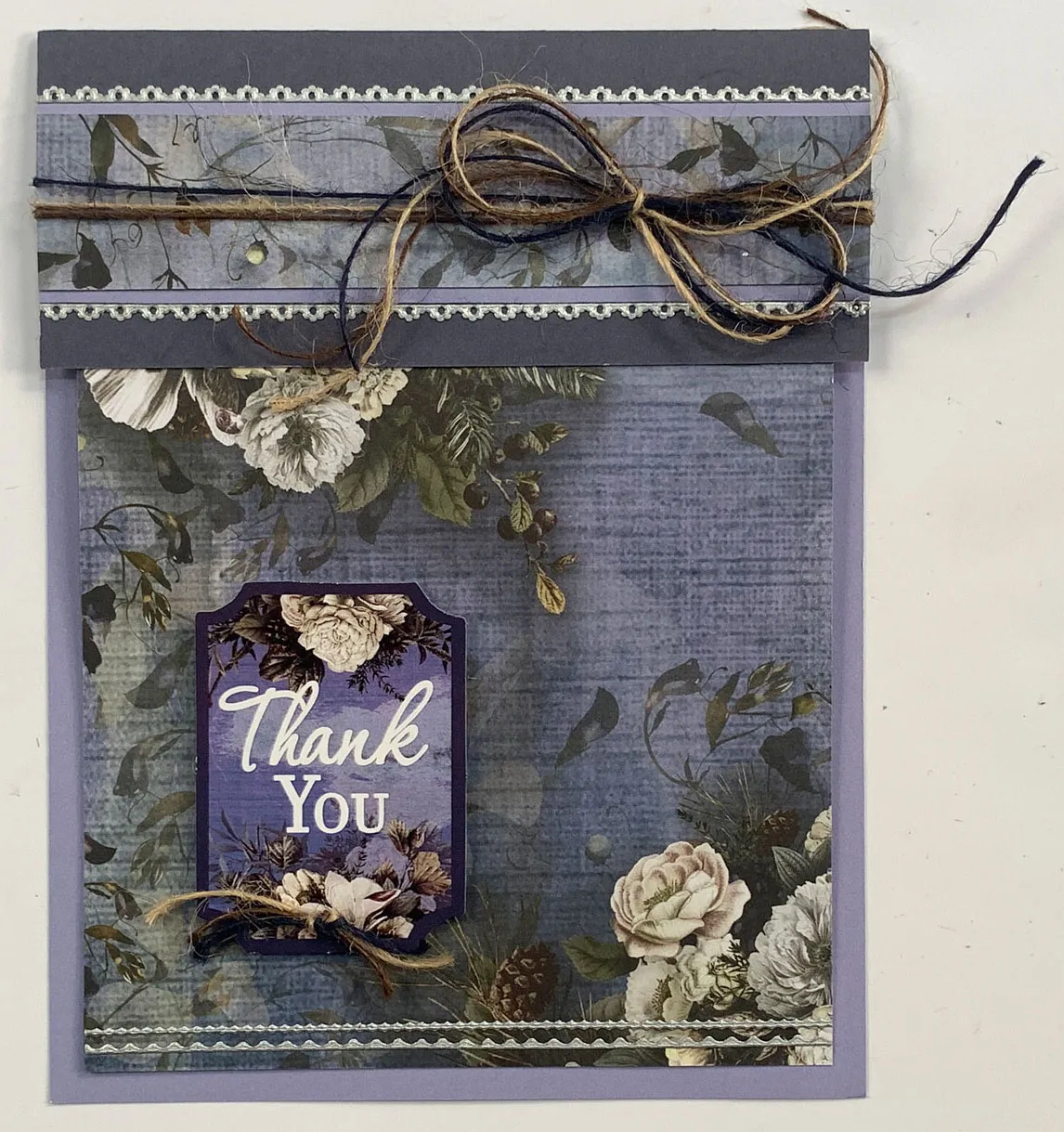 2. Cut 5"x1" Ethereal Bouquets blue floral cardstock and mat the long edges on light blue cardstock with 1/16" borders. Glue it centered across the card’s short front flap. Place silver thin line Dazzles™ along the long edges, trimming the excess. Wrap a 6½" strand each of natural, navy, and brown twine across the center and glue the ends to the flap back.