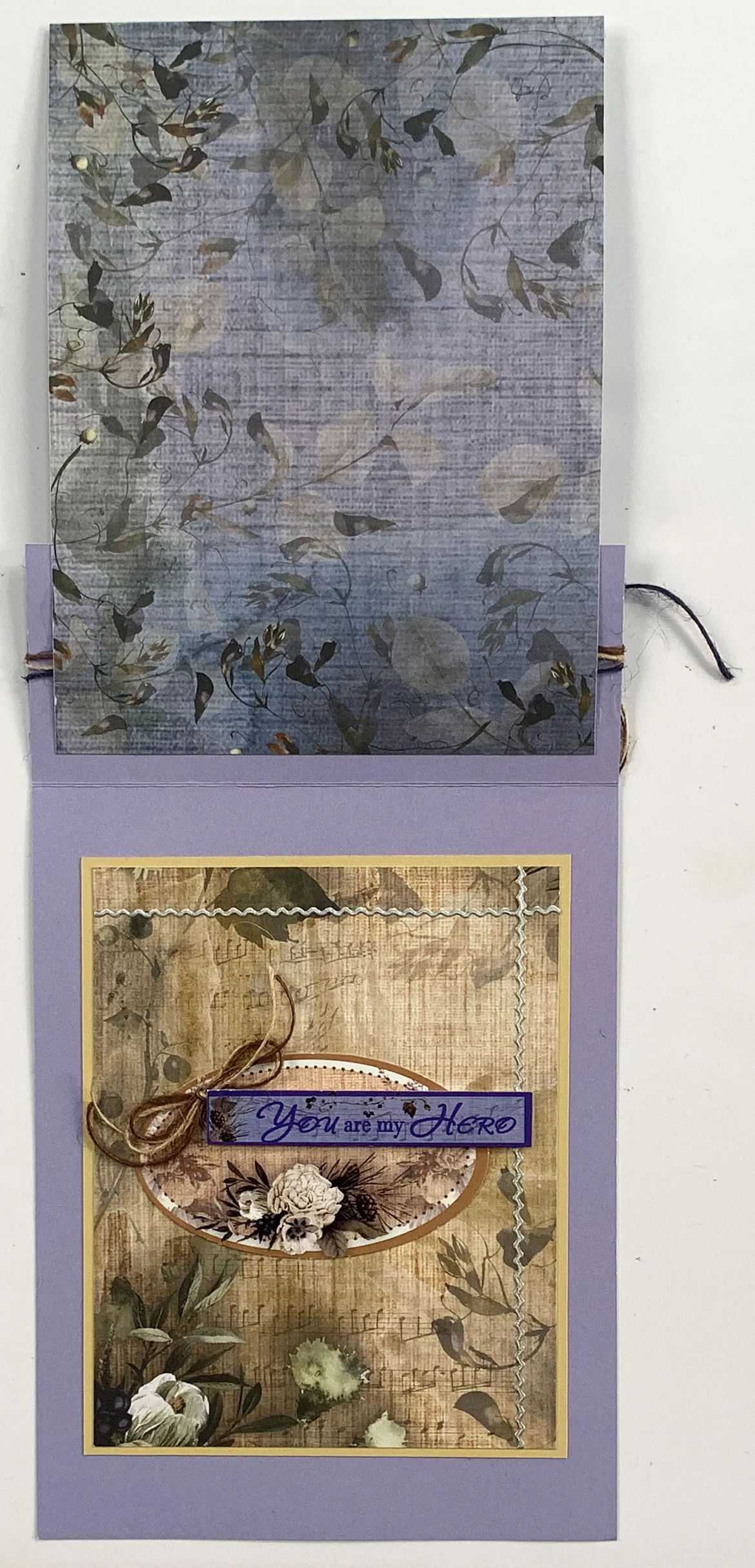 7. Glue the Ethereal Bouquets tan oval die-cut and foam tape the “you are my hero” die-cut as shown. Hold brown and natural twine together and tie a shoestring bow. Glue it just under the upper left corner of the sentiment.