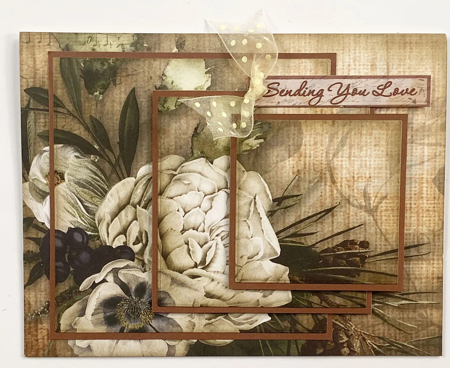 1. For the card front: Cut 6½"x5" Ethereal Bouquets tan floral cardstock with the large flower bouquet in the lower left corner and ink the edges. Position the 4½" square die ½" from the left edge and die cut it. Use the repositionable tape to secure the square in the hole, then position the 3¼" square 2" from the left cardstock edge and die cut it. Secure it in the opening with tape, then die cut the 2½" square from the cardstock, placing the die 3¼" from the left edge.