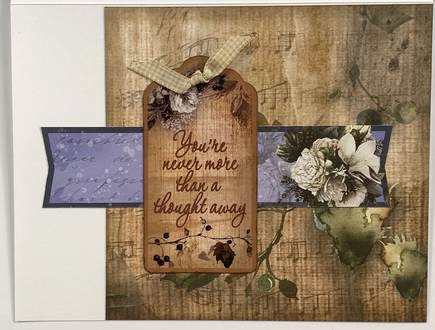 5. For the inside: Cut 5"x5" Ethereal Bouquets tan music cardstock and ink the edges. Glue it to the inside along the right card edge. Cut out the Ethereal Bouquets blue banner and glue it across the center. Ink the edges of the Ethereal Bouquets tan “you’re never more…” tag die-cut, then glue it to the inside center. Knot 3" of ¼" wide gingham ribbon and glue the knot to the tag top.