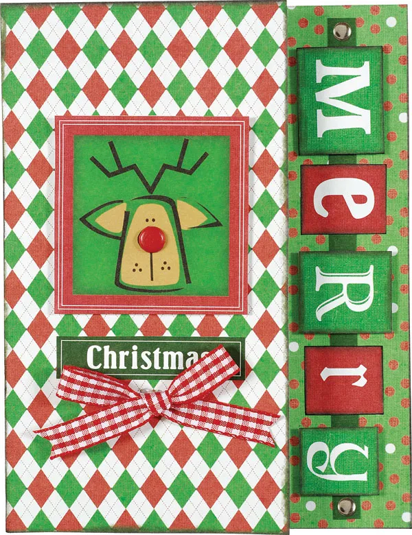 For the inside: Glue the dots on green paper to the right side. Glue the green paper ribbon centered on the dots. Foam tape the alphabet tiles along the paper ribbon. Glue the argyle paper centered on the inside. Glue folded red gingham ribbon behind the top of the “Wishing you…” word art. Glue the word art centered on top of the argyle paper.